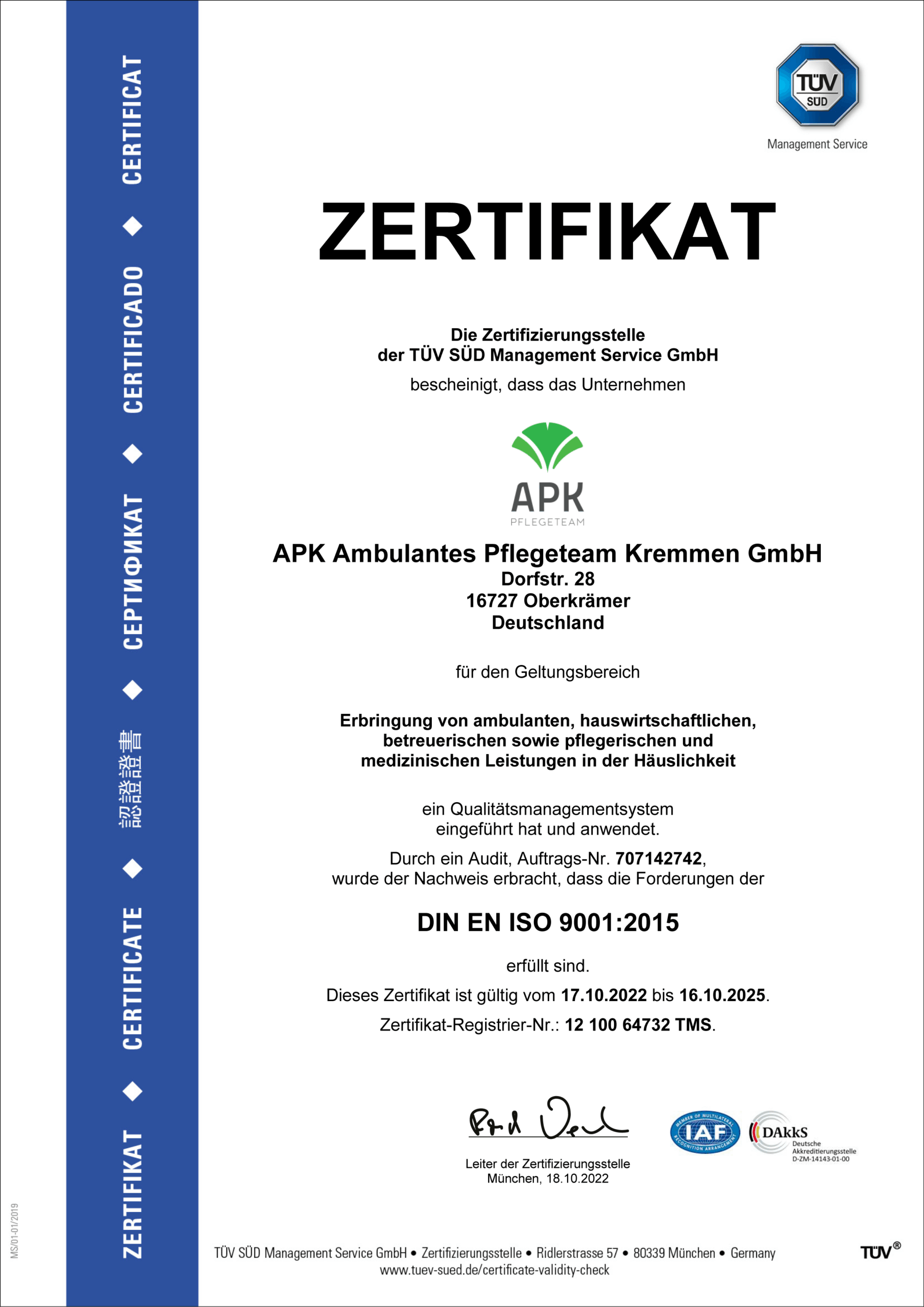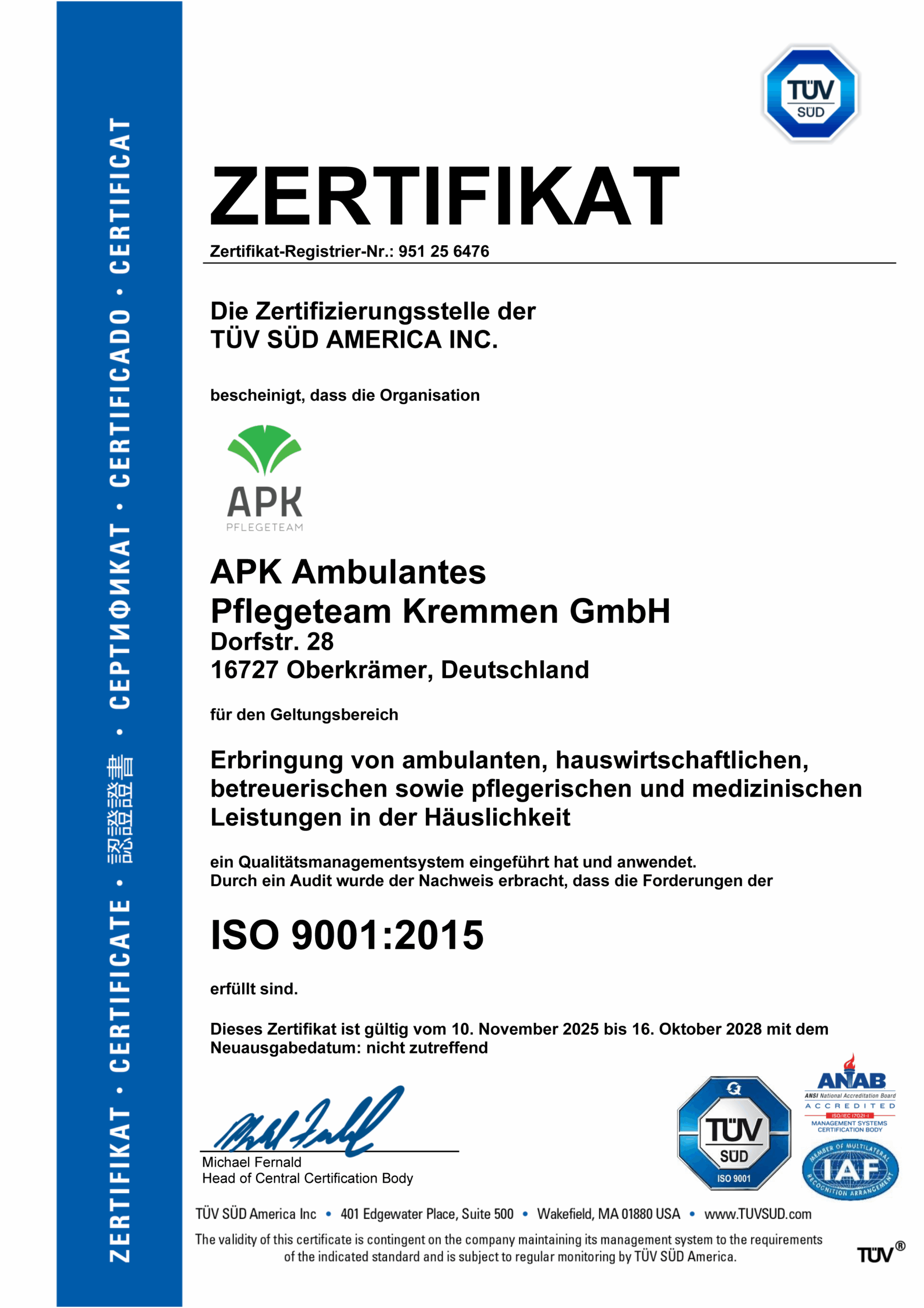 Das Qualitätsmanagement-System des ambulanten Bereichs der APK Ambulantes Pflegeteam Kremmen GmbH ist nach ISO 9001:2015 zertifiziert. Die Zertifizierung bezieht sich ausschließlich auf die ambulanten Pflegedienstleistungen.